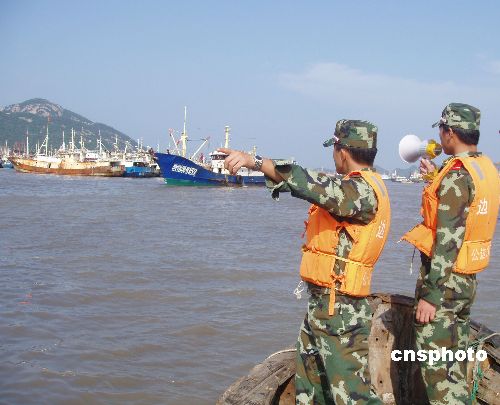 9月15日,台州市边防支队官兵引导进港避风渔船。据气象部门预报,今年第13号强台风“珊珊”正以每小时10-15公里的速度向西北方向移动。预计强台风将逐渐向台湾东部沿海靠近,今天夜里进入我国东海南部海域。受其影响,今天夜里起浙江沿海海面有10-12级偏北大风。为确保人民群众生命财产安全,浙江省台州市海事、边防、渔政等相关部门正全力展开行动,帮助渔民安排好迎战强台风的工作。中新社发 汤永祥. 摄