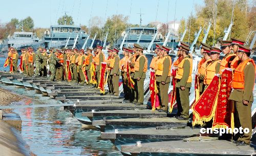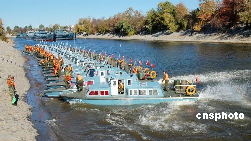 10月4日,驻黑河某边防巡逻艇大队首批20余艘执勤船艇,圆满完成2006年度中俄界河黑龙江明水期巡逻执勤任务,船艇编队顺利返航驶入军港。进入10月,黑龙江上游江面即将结冰封冻,驻守在中俄三千里界江上的执勤船艇官兵陆续返航。中新社发 邱齐龙 摄