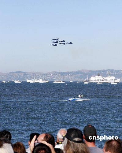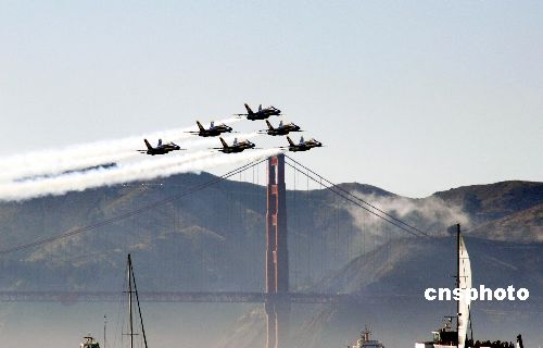 当地时间十月八日,在美国一年一度的旧金山舰队周活动上,创建六十周年之际的美国“蓝天使”特技飞行表演队进行飞行表演。图为六架F-18大黄蜂战斗机正编队穿越金门大桥。中新社发 刘丹 摄