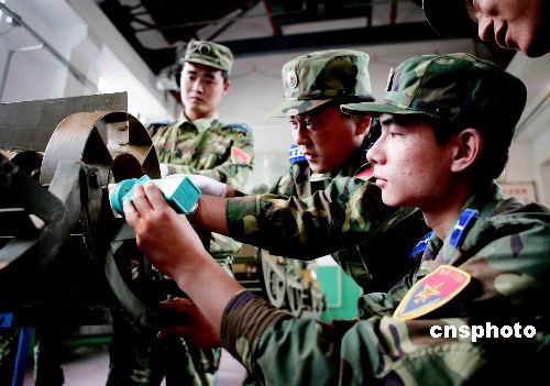 为适应现代战争特点,济空某军械仓库经过创新改装,已基本实现物资包装集装化,搬动运输机械化的能力。他们先后研制、改装的23种118件机械设备大都被空军装备仓库推广使用。10月初,他们研制生产的某型导弹引信口清冼油封器,荣获国家科技进步三等奖。10月9日,科研小组人员在进行新的项目改装。中新社发 崔文斌 摄