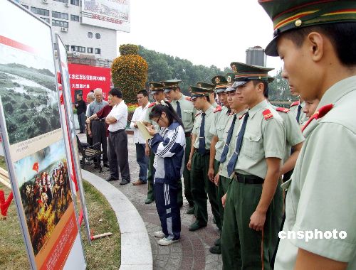 10月20日上午,浙江瑞安公安边防大队20名官兵参观驻地举办的纪念中国工农长征胜利70周年大型图片展。期间,社会各界群众也前来观看展览。中新社发 陈孝和 摄