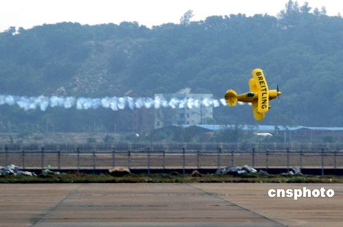 十一月一日,珠海航展开幕后第二天,英国金梦飞行表演队驾驶四架小飞机做精彩空中飞行表演。图为其中一架小飞机超低空而过时的情形。中新社发 孙自法 摄