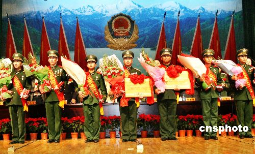 | 十一月六日下午,新疆公安边防总队召开表彰大会,参加天山-1号(2006)中哈联合反恐演习的两支武警机动中队和一百六十八名精英将士受到表彰。八月二十四日至二十六日,为期三天的天山-1号(2006)中哈联合反恐演习分别在哈萨克斯坦阿拉木图州和中国新疆伊宁市举行,新疆公安边防总队和新疆反恐怖特别侦察队的八百名官兵参加了此次演习。本次演习是在上海合作组织框架内,中哈执法安全部门首次举行的联合反恐演习,提高了对两国执法安全机关联合打击恐怖主义的组织能力和协同作战能力,对于震慑和打击本地区“三股势力”,维护边境地区的安全稳定有着十分重要的意义。中新社发 刘新 摄