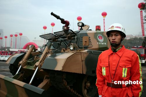 十一月八日,随着“11·9”消防日的到来全国各地展开消防宣传活动。山西省太原市在湖滨会堂门前举行以“万人签名”为主题的大型消防演习宣传活动。图为最新型的消防坦克。中新社发 张云 摄