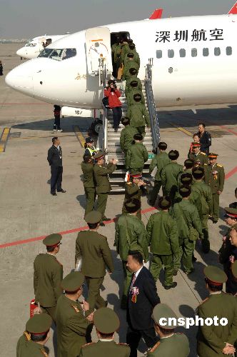 十二月十八日上午,来自深圳经济特区的二百五十名新兵乘深航专机分赴军营。解放军总后勤部军交运输部副部长刘冀和少将、广州军区联勤部副部长黎仕林少将等到深圳宝安国际机场送行。中新社发 陈文 摄
