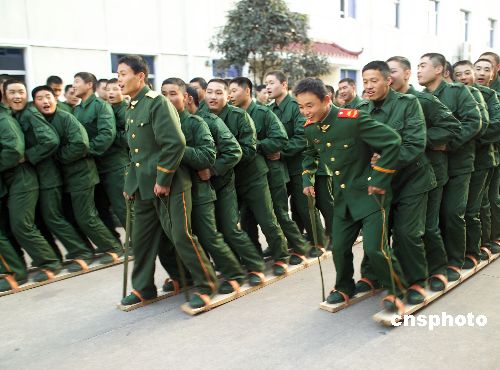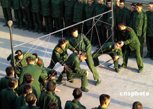 2006年12月21日,武警湖北总队武汉市支队新兵正在接受同心同行板训练。武警湖北总队把心理行为训练作为新兵训练的主要课目之一,为今后执勤反恐打下坚实基础。中新社发 宋建春 摄
