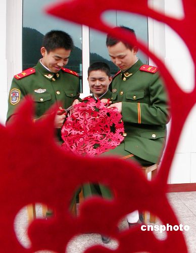 1月1日,武警浙江省温岭市中队的营房里, 战士们利用休息时间, 自制剪纸窗花装饰“新家”, 红红火火喜迎新年第一天。中新社发 江勇兵 摄