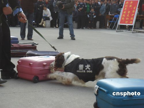 1月9日,在桂林火车站广场,柳铁警方的警犬在现场进行搜毒表演。当天,柳州铁路警方以桂林、柳州车站为重点,在管内各车站广泛开展“警民和谐筑平安”爱民实践活动。据了解,每年的1月10日是全国公安机关爱民实践统一活动日。中新社发 欧惠兰 摄