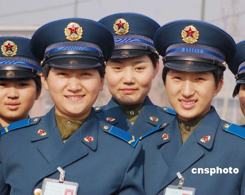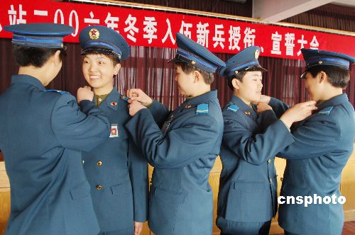 2月11日,济南空军某通信总站新兵二连的女兵们穿上崭新的军装并佩带新军衔。当日,该部为2006年冬季入伍的新兵们举行授衔、宣誓仪式。中新社发 耿国庆 摄