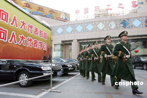3月7日,一队武警士兵冒着寒风在十届全国人大五次会议代表驻地的“北京职工之家”外巡逻。中新社发 毛建军 摄