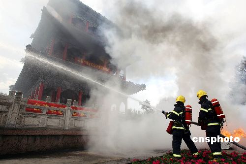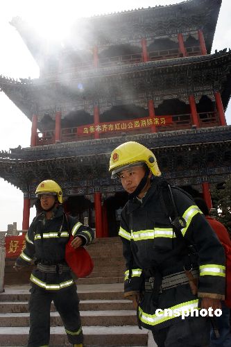 四月二十六日,新疆乌鲁木齐红山公园山顶古建筑——远眺楼举行古建筑消防演练。据悉,自五月一日起,该公园将对市民免费开放,届时入园游客将成倍增加,由于公园内木质建筑众多,为预防突发火情等各类安全事故发生,特举行此次消防演练,确保为市民和游客提供一个安全、舒适的游园环境。中新社发 刘新 摄
