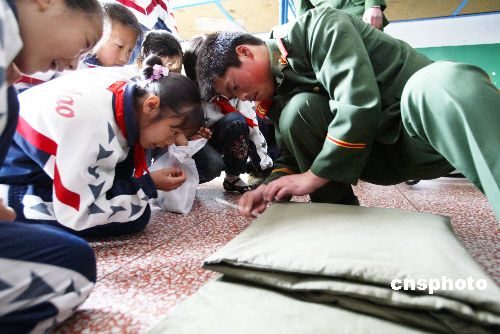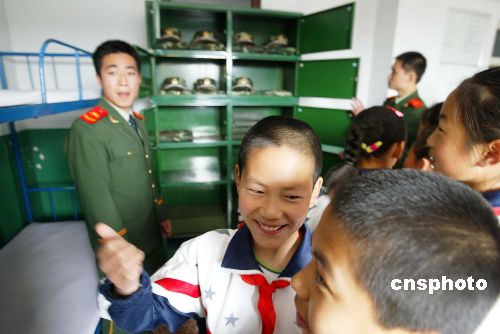 5月13日,辽宁丹东九道小学的孩子们到丹东边防检查站体验警营一日。孩子们通过参观警营内务,观看战士们军事训练,体验了警营有续而严格的军事化生活。孩子们向战士赠送了自己制作的礼物和亲手绘制的图画。中新社发 陈浩浩 摄