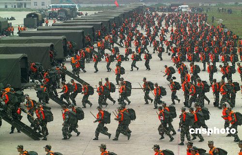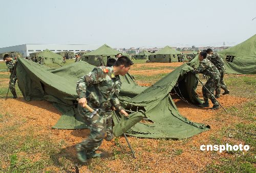 2007年5月25日,武警湖北总队举行抗洪抢险演练。随着汛期临近,武警湖北总队组织了1200名官兵成立抗洪抢险突击队,从组织指挥到救灾物资和后勤保障等方面进行拉动演练。中新社发 宋建春 摄