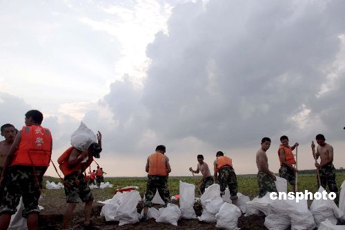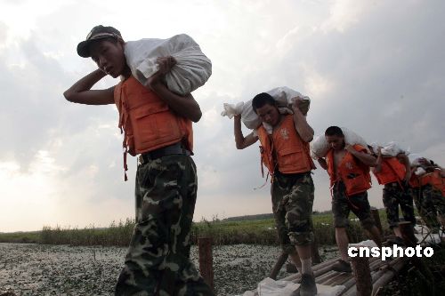 七月十七日,淮河中游的焦岗湖出现大面积漫堤险情,湖水水面已和大坝基本平行,当地村民赶往现场抢险,武警安徽省总队出动数百名官兵上堤抢险。中新社发 盛佳鹏 摄