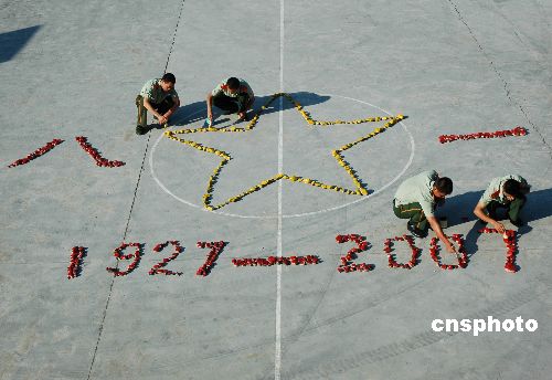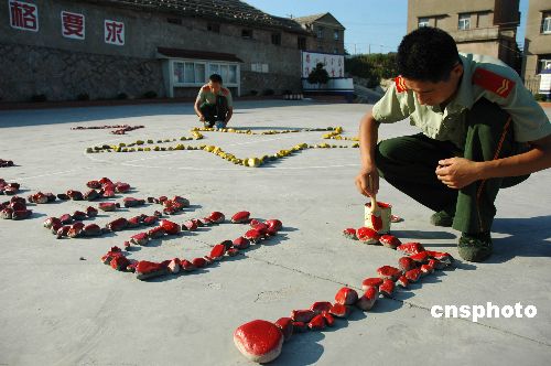 7月26日,驻守在浙江台州椒江区大陈岛上的边防官兵,用海滩上捡来的鹅卵石,在操场上排成“八一”的图案,以海岛边防军人特有的方式迎接建军80周年的到来。中新社发 郏策 摄