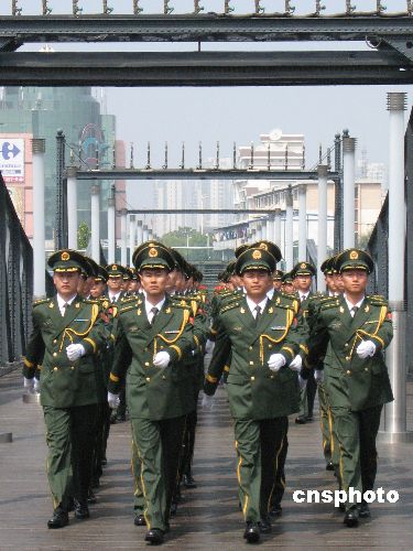 8月1日,武警驻津部队在象征天津解放的标志性建筑——金汤桥上,举行“固若金汤·军旗高扬”——军民共庆建军八十周年暨新军服换发仪式。中新社发 田齐 摄