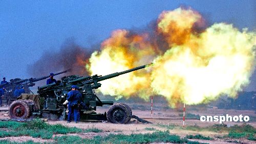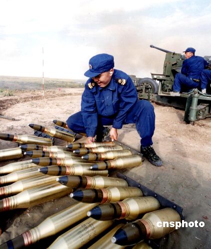 8月27日,位于黄海某海域的盐碱沼泽地带,北海舰队某高炮部队官兵投入“新三打”(打武装直升机、打隐形飞机、打巡航导弹)课目演练。2007年以来,该部队与有关单位联合开发的各炮手训练模拟器、数字指挥仪等一批革新的数字装备,全部被运到演习场进行实地检验,不但使某型高炮能全天候、全方位地对目标实施跟踪射击,而且使射击精度提高到90%以上。中新社发 汪汉宗 摄