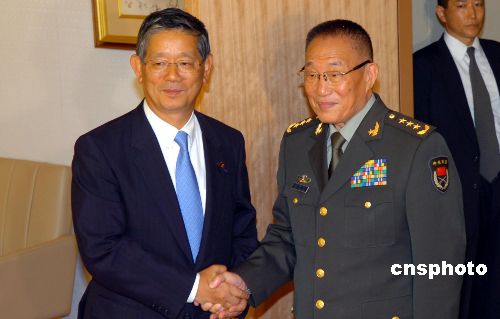 8月30日下午,中国国防部长曹刚川上将在日本外务省会见了日本外相町村信孝并与其进行了会谈。图为曹刚川上将与町村外相会谈前握手。中新社发 滕剑峰 摄