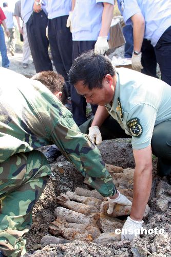 9月21日11时许,江苏徐州警方在铜山县张集镇魏集村老回山山谷内集中销毁一批废旧爆炸物,共计销毁废旧军用炮(炸)弹212枚、雷管9114余枚等。背景资料:据悉,这次销毁的废旧军用炮(炸)弹,是近两年来在一些建筑工地以及市政工程施工中发现并收集上来的,其中有废旧炮弹、炸弹、燃烧弹、航空炸弹等,这些炸弹多是二战期间和解放战争期间未引爆的炸弹,性能很不稳定,具有一定的危险性。另外,近万枚雷管和危险爆炸物品,是在近几个月治爆缉枪专项整治中,由公安机关收缴上来的。中新社发 雍君 摄