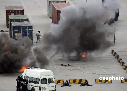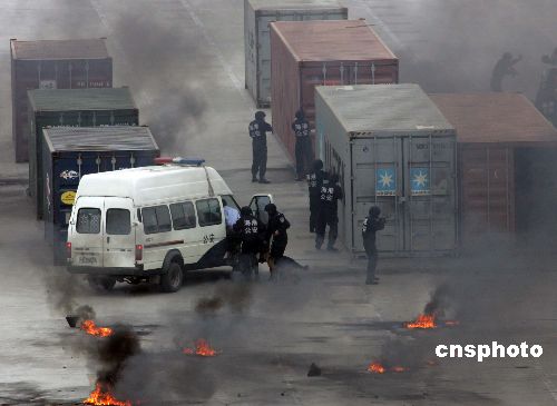 图为情景设置:国际恐怖组织策划武装劫持开往A国的集装箱,海港公安阻截并捉拿藏匿在集装箱内的恐怖分子。中新社发 潘索菲 摄