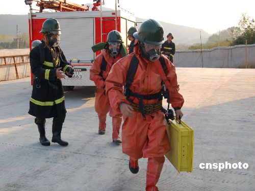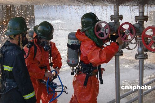 11月6日,安徽省含山县举行特种设备“事故”应急反应演习,质量技术监督、消防、特种设备救援等多支专业队伍参加了演习。演习旨在检验发生特种设备重特大事故后的现场联动反应能力,提高相关部门在信息传递流程、应急反应速度和应急救援技能。中新社发 田斌峰 摄