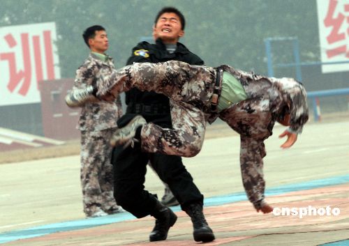 中国武警部队特勤大队11月12日上午在北京举行摔擒演练等训练科目表演。来自42个国家的59名驻华武官,参观了这次武警官兵表演的搏击拳、射击、一招制敌、战术基础动作、五人战斗小组情况处置演练、公共汽车反劫持等训练科目表演,并参观了大队部分武器装备。这支组建于2002年12月的部队,是美国“9·11”事件后,中国为防范和打击恐怖主义而专门组建的反恐特种部队,共四百余人,主要担负处置重大恐怖事件中心区武力突击任务。他们先后四次参加国家级反恐综合演习,并参加了“合作-二00七”中俄联合反恐演习,目前已初步具备了反恐制胜的作战能力。中新社发 宋吉河 摄