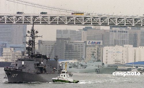 11月28日,中国海军“深圳”号(舷号167)导弹驱逐舰在日本海上自卫队“雷”号护卫舰的引导下如期抵达东京晴海码头,开始对日为期四天的友好访问。这是中国海军军舰第一次访问日本。中新社发 朱沿华 摄