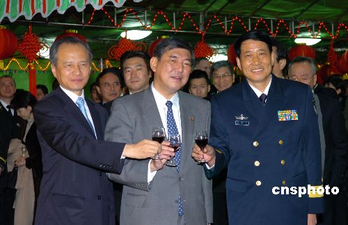 11月30日晚,正在日本进行正式友好访问的中国海军导弹驱逐舰“深圳号”在甲板举行招待会,日本防务大臣石破茂、海军司令吉川荣治,中国驻日大使崔天凯、公使孔铉佑、武官徐京明等出席,日本107护卫舰官兵代表及各国驻日武官三百多人参加。图为崔天凯大使(左)、石破茂防务大臣(中)和中国海军军舰访日团指挥员、南海舰队副司令肖海洋少将,共同举杯祝愿中日两国世代友好。中新社发 滕剑峰 摄
