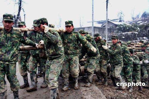 2月21日元宵节,武警官兵在合力抬电杆。贵州因遭遇雪凝灾害,电力等设施受到严重损毁,各级部门人员投入到抗灾救灾一线,元宵佳节也未能与家人团聚。当天武警毕节支队官兵们在大山上的抢修现场度过元宵节,他们的中餐、晚餐都是在大山上吃盒饭。中新社发 郭勇 摄