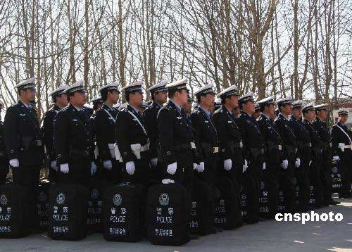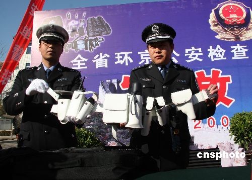 2月27日,河北省环京公安检查站公安单警装备发放仪式在涿州高速交警大队举行。环京公安检查站是构筑河北省“护城河工程”的第一道防线,承担着环京安全保卫、“平安奥运”的打造和首都重大活动的安全保卫任务。此次发放的单警装备包括:警服、多功能腰带、警棍、手铐、催泪喷射器、强光手电、警用制式刀具、急救包、防割手套以及防刺服、警用水壶、对讲机、警务通、警用装备包等。单警装备的配备和使用,将大大增强河北省环京公安检查站一线民警个人防护能力、打击违法犯罪的实战能力和公安装备正规化建设水平。中新社发 顾文娜 摄