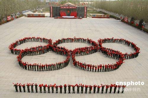 2008年5月8日,奥运火炬成功完成珠峰传递的消息传来,即将执行青藏线运输任务的解放军总后勤部青藏兵站部某汽车团官兵组成“五环”标志,庆祝奥运梦想首次登上世界第三极。中新社发 吴苏琳 摄