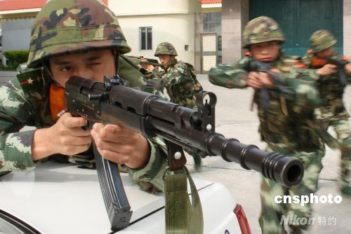 5月10日,武警福建总队泉州支队反恐分队进行了一场以奥运圣火受到干扰和遭到破坏为背景的实战演练,为奥运圣火在福建顺利传递提供安全保障。图为反恐分队的武警官兵们正在进行“反骚乱”演练。中新社发 张九强 摄