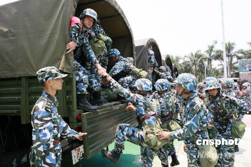 5月14日13时,中国南海舰队海军陆战队某旅抢险救灾部队第一梯队760名官兵紧急起程奔赴四川汶川地震灾区。中国南海舰队海军陆战队将累计出动2500名官兵,第一梯队的760人已经出发,他们采取摩步化机动方式行进1800多公里,预计48小时后抵达汶川灾区。中新社发 李唐 摄