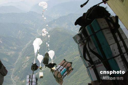 5月16日11时59分,中国空军航空兵某师在向四川地震灾区空投救灾物资。连日来,空军发挥空中运输优势,连续出动大型运输机,不间断大规模的向四川灾区投送灾民急需的药品、食物、帐篷等生活用品。中新社发 谭超 摄