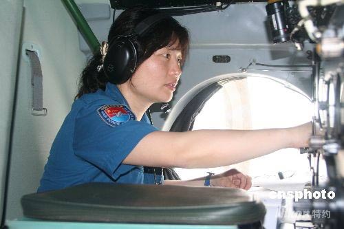 5月18日,中国空军运输航空兵某师七名女飞行员驾机升空直飞灾区,紧急空运物资。上午11时33分,由女飞行员宋雪飞、王亚平、陈宇、陈金兰、曹艳艳、王鸿、刘文力驾驶的7架飞机装满30多吨救灾物资先后昂首起飞,15时38分全部到达成都双流机场。图为女飞行员检查机载设备。中新社发 周建华 摄