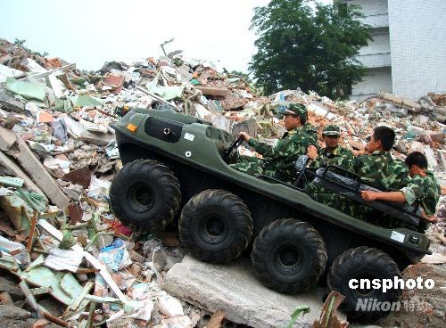 5月22日,德阳消防什邡地震救援突击队的官兵驾驶水陆两栖车涉水前往什邡市红白镇救援。当日上午,四川消防总队德阳消防什邡地震救援突击队周密部署,军用直升机与地面推进的水陆两栖全地形车遥相呼应,有效提高了在什邡复杂地形中救援抢险工作的进程。中新社发 张建成 摄
