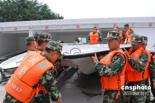 六月二日,阴雨天气继续笼罩福建。连日来,受冷暖空气共同影响,福建各地普降大雨到暴雨,担负抗洪抢险突击队的武警福建总队直属支队官兵积极做好各项准备工作,备战抗洪抢险救灾。图为船艇中队官兵正在装载船艇。中新社发 曾朝群 摄