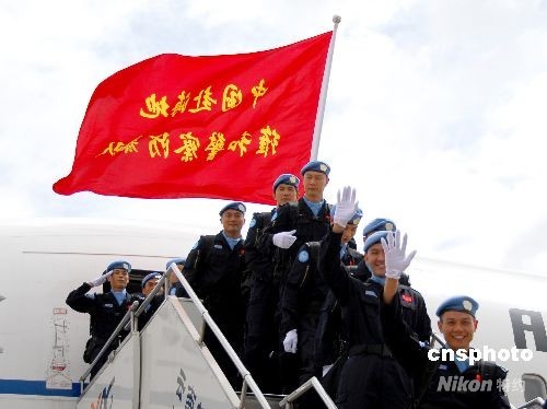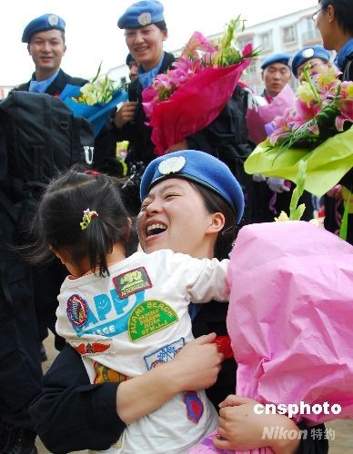 8月15日上午,中国第六支赴海地维和警察防暴队95名队员飞抵昆明巫家坝国际机场,加上此前已经回国的30名先遣队员,这支由125名队员组成的队伍圆满完成为期8个月的联合国海地任务区维和任务,胸挂联合国“和平勋章”凯旋回国。中新社发 甘娜 摄
