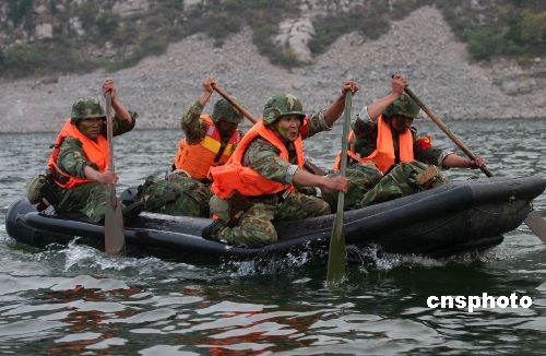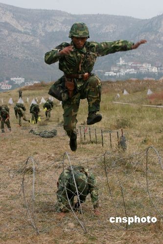 10月18日,济南军区侦察兵动态比武展开。满脸油彩的侦察队员们身负35公斤战斗装具行军50公里,主要进行了夜间行军、操舟越障、通过雷场、侦察报知、调制要图、山地攀登六项课目考核。中新社发 崔成俊 摄