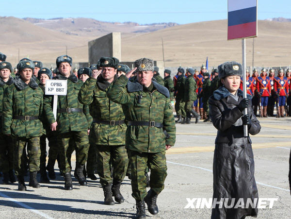 11月8日,蒙古国和俄罗斯联合维和军演在蒙中部的中央省正式开始。这次军演为期30天,在蒙中部的中央省和北部的鄂尔浑省进行,是苏联解体后蒙俄两国首次举行联合军演。蒙俄共有700名官兵参加演习,其中450名为俄方官兵。 新华社记者郝利锋摄