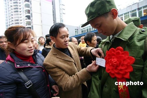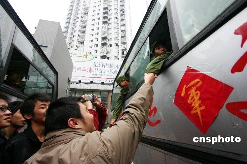 11月19日,进藏新兵在亲人们的欢送下离开家乡。当日,重庆市永川区首批进藏新兵在区人武部大院集中,完成了相关交接手续后,新兵们在亲人的祝福声中,登上大巴车依依不舍地告别亲人、告别故乡,踏上了保家卫国的征程。中新社发 陈仕川 摄