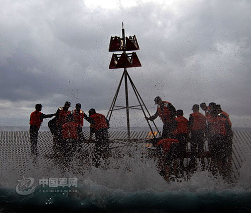 近日,南海舰队某登陆舰支队把舰艇拉到陌生海域,并在恶劣气象条件下开展实弹射击、航行补给等科目训练,着力提升部队核心军事能力。图为实弹射击前官兵顶风破浪投放靶标的情景。 中国军网发 李彦林摄