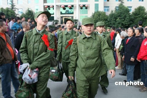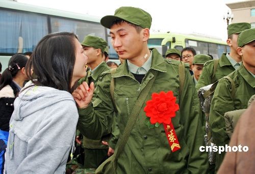 11月23日,四川眉山市首批奔赴西藏服役的新兵,告别家乡踏上保卫祖国的征程。在今年的冬季征兵中,作为地震灾区的眉山市广大适龄青年,被来到当地参加抗震救灾的英勇的部队官兵所感动,纷纷报名应征入伍,其中还有不少灾区青年和在灾区做志愿者的青年踊跃报名。中新社发 尧遥 摄