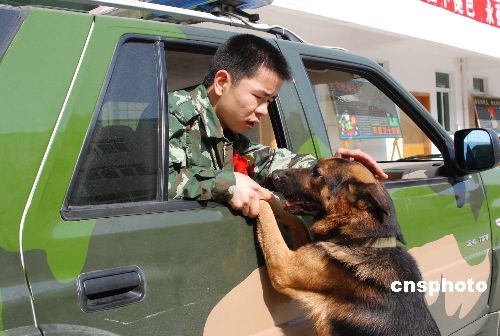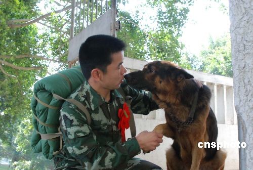 十一月二十四日,武警福建总队直属支队的训犬员张世均与息息相处五年的无言战友“飞虎”依依惜别。又到老兵退伍的日子,在武警福建总队服役期满的三千多名老兵,开始踏上返乡的路程。中新社发 曾朝群 摄