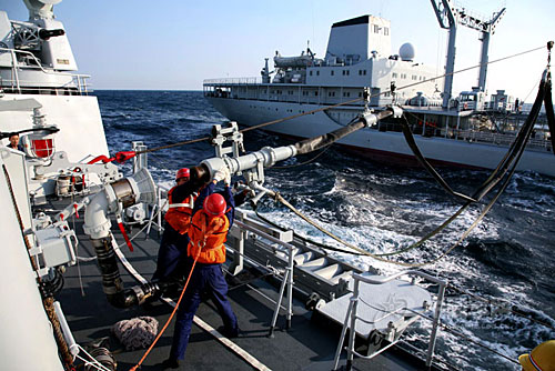 海军某部注重把舰艇拉到生疏海域,按实战要求开展战法训法演练,提高部队综合保障能力。图为11月上旬该部舰艇正在进行海上补给训练。 中国军网发 张群摄