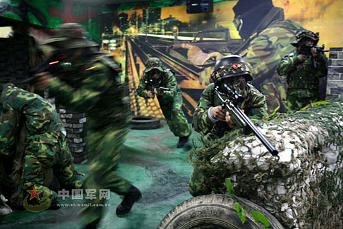 “Go,Go,Go!”12月2日下午, 一场激烈的“战斗”对决在一块特殊的阵地上进行。“战场”上矮墙林立、沙包堆积、枯树横亘,周围则“炮火”连天,上空“飞机”盘旋……。战士们身着作战服,手持仿真枪,头戴装有感应器的头盔,在时明时暗的“夜空”下穿梭,寻找目标,激烈对抗。这是某炮兵团日前建成的真人CS对抗阵地上的精彩一幕。据前来观摩的总部领导介绍,实施真人CS对抗练兵在我军部队还是首家。