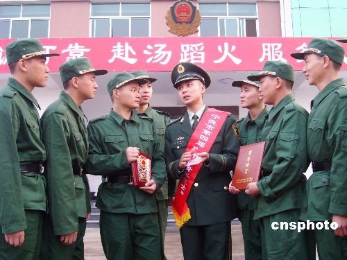 12月19日,福建宁德市消防支队新兵连举行“中国消防卫士——贺曦英模先进事迹报告会”。当日下午,刚参加宁德市第四届“十大青年卫士”颁奖典礼的贺曦应邀来到新兵连,为官兵们作了抗震救灾先进事迹报告。 中新社发 唐海波 摄