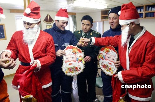 图:边防战士扮"圣诞老人"为外籍船员送祝福