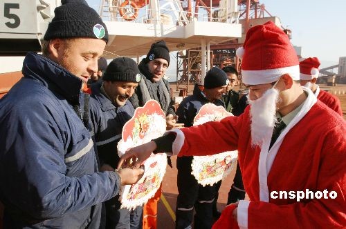 12月23日,江苏公安边防总队连云港边防检查站的战士扮成“圣诞老人”来到停泊在连云港口岸的外轮上,为外籍船员送去祝福和圣诞礼物,让外籍船员在中国感受圣诞快乐。中新社发 王健民 摄