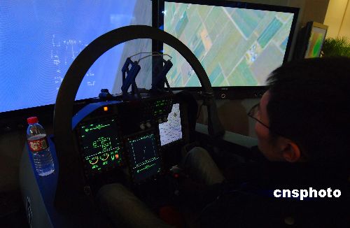 一名工作者在北京展览馆隆重开幕的“中国航空工业走向世界成就展”上,操作中国枭龙飞机驾驶舱模拟仪,享受空中飞行的乐趣。